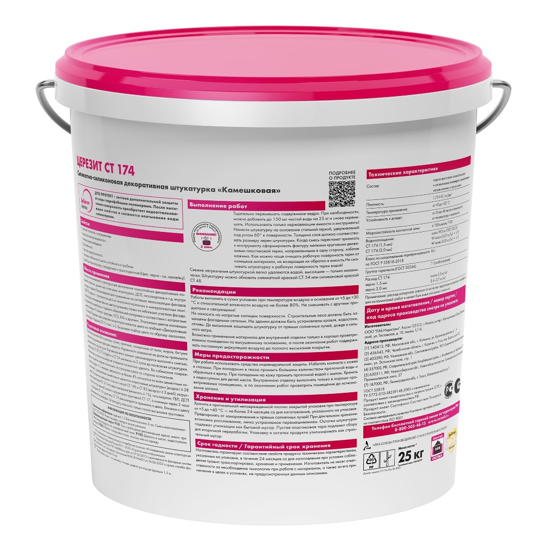 Штукатурка СТ 174 силикатно-силиконовая "камешковая" 1.5 мм база 25 кг предназначена для создания структурных покрытий на поверхностях фасадов и внутри помещений, в том числе при устройстве систем теплоизоляции фасадов (c пенополистирольными и минераловатными плитами). Наносится на любые минеральные основания, такие как бетон, штукатурка (цементная и гипсовая), гипсокартон, древесностружачные плиты.