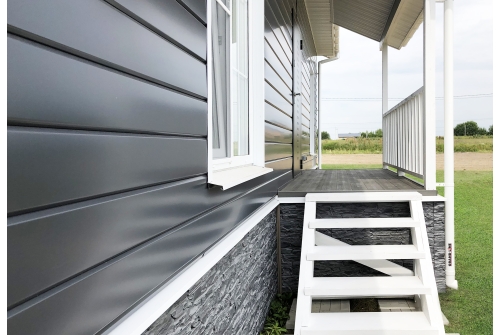 - В отличие от облицовки фасада деревом, металлический сайдинг «ЭкоБрус GL» прост в монтаже и не требует дополнительного послемонтажного ухода.